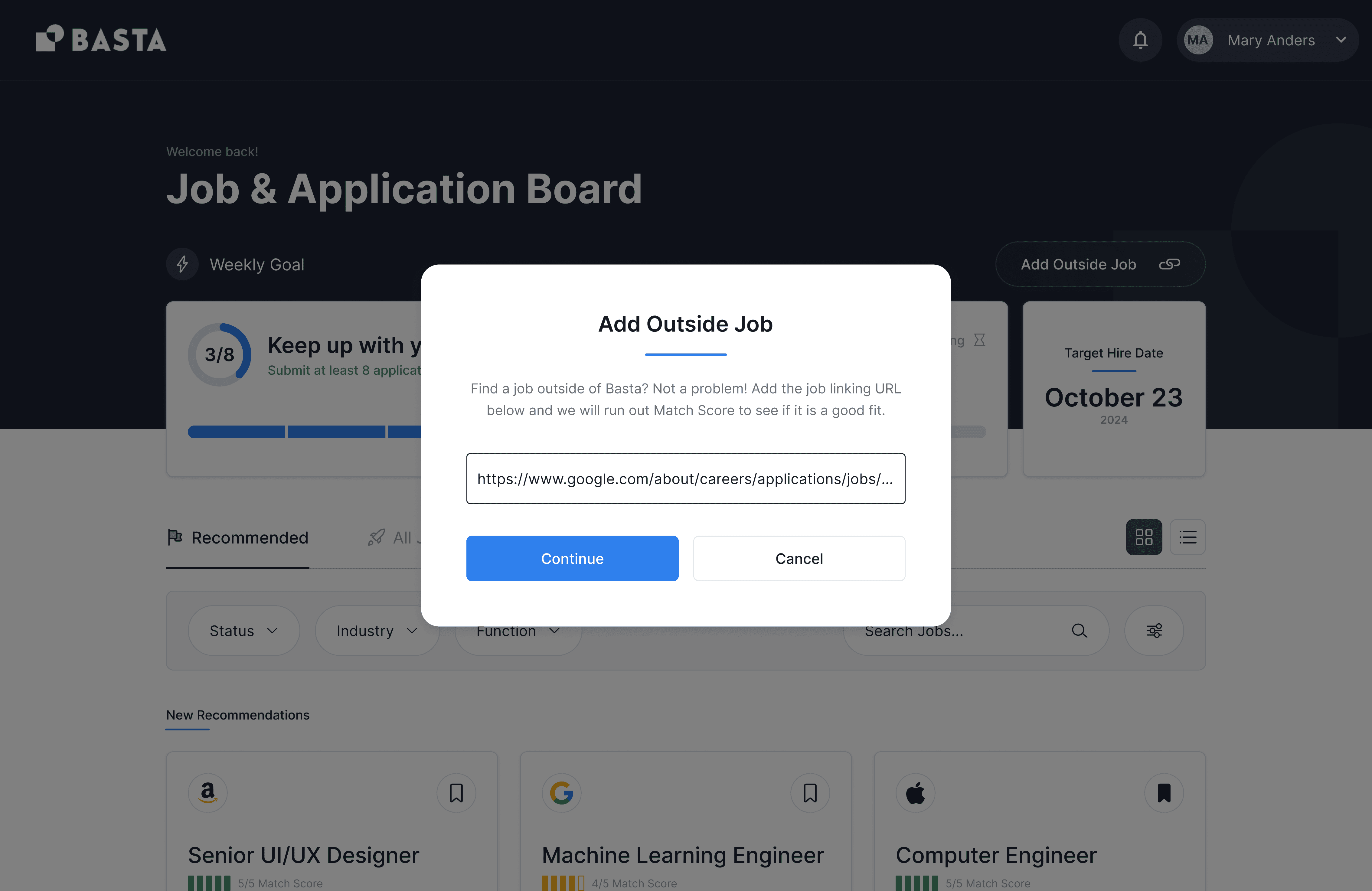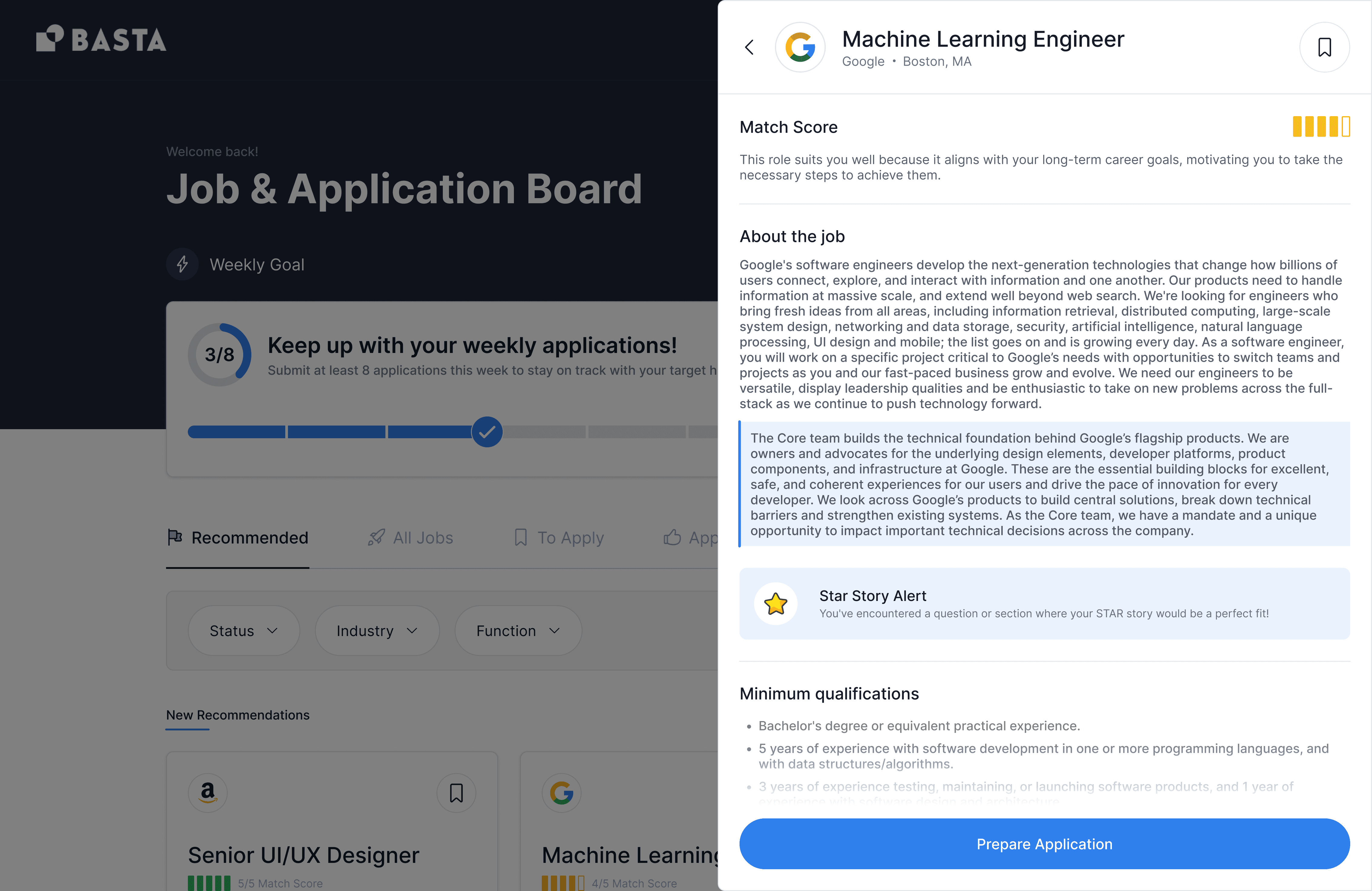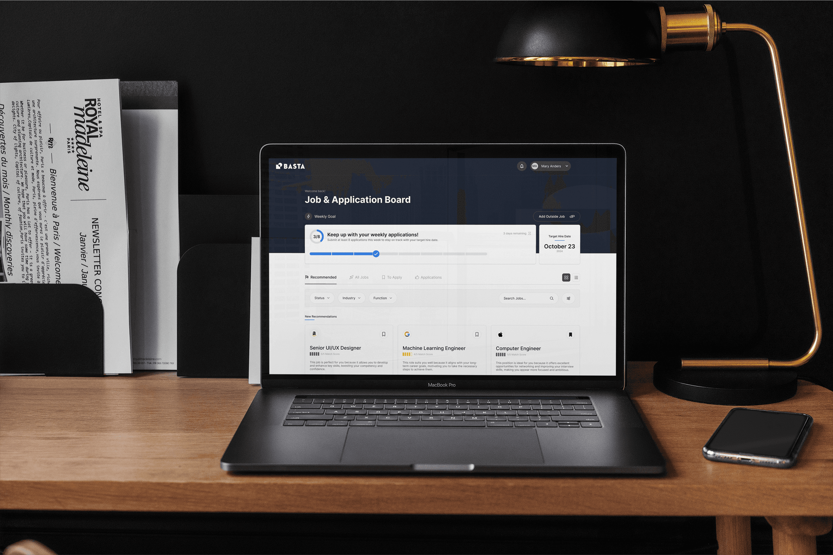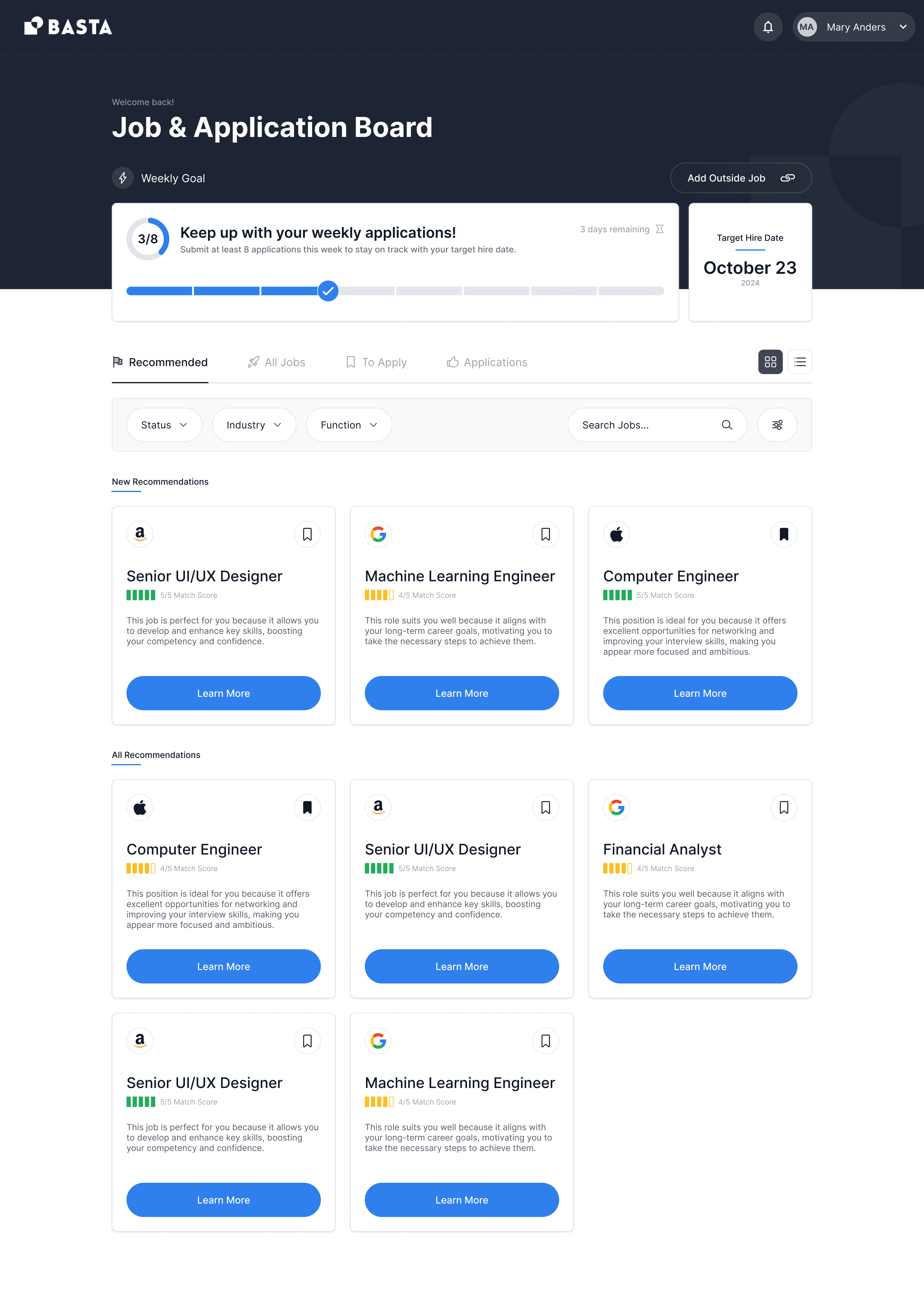 Project Basta had a strong platform supporting first-generation college students in their job search, but its UI needed a refresh to better serve users. As their program grew, navigating resources, accessing career coaching, and preparing for interviews became less intuitive. Users needed a more seamless experience—one that made it easier to track progress, find relevant job opportunities, and engage with mentors. Along with improving usability, Basta wanted to introduce new features to enhance job readiness and better connect students with career opportunities.